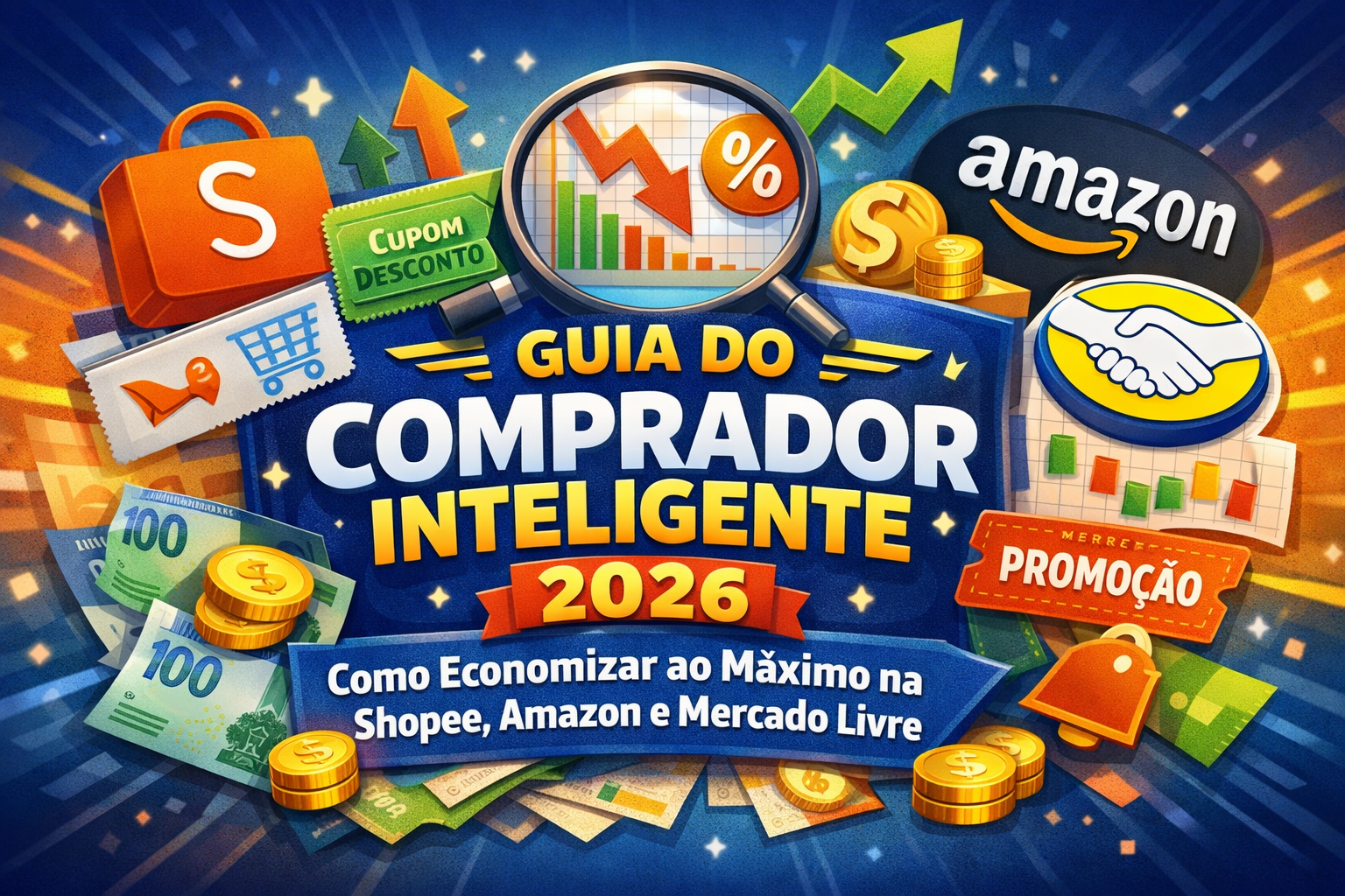Comprar online em 2026 virou parte do dia a dia — e saber economizar deixou de ser um diferencial para se tornar uma habilidade essencial. A boa notícia? As grandes plataformas como Shopee, Amazon e Mercado Livre oferecem ferramentas e algoritmos que podem trabalhar a seu favor… se você souber usá-los corretamente. Este guia completo, estratégico e atualizado, foi construído para te transformar em um comprador profissional, capaz de economizar 30% a 70% em compras comuns — de eletrônicos a produtos domésticos. Além disso, ao longo do artigo você encontrará links sugeridos que podem ser monetizados caso esteja usando o texto em um blog com programas de afiliados. Prepare-se: este conteúdo tem mais de 1500 palavras, é otimizado para SEO, altamente escaneável e pensado para manter o leitor preso até o final.